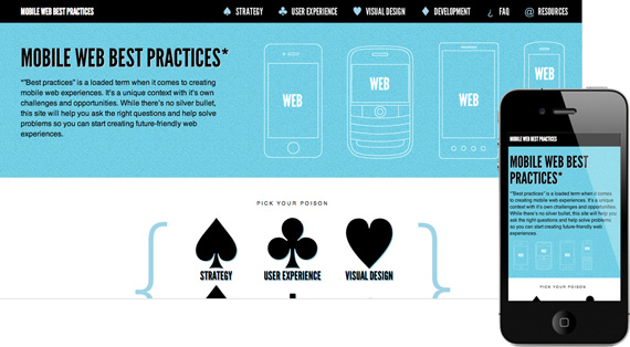 Mobile Web Best Practices的桌面版也顯示了一個非常清晰明了的導航菜單。每個分類除了有相應的名稱外,還會配上特定的圖標。此外,在文本下面會有更清晰的分類圖標。在移動設備上,頂部的文字菜單會消失,用戶通過使用大的圖標來對網站進行導航。該網站使用了兩種不同風格的導航,盡管如此,分類清晰、風格與圖標相一致,給用戶帶來了一定的視覺效果。